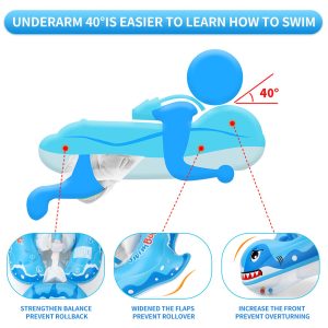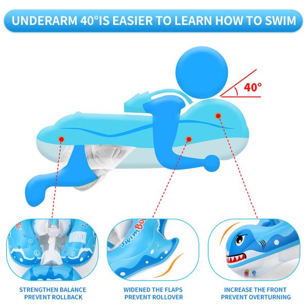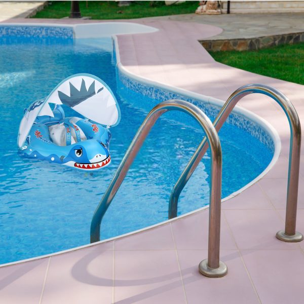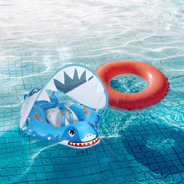 Colacul de inot cu suport burtica si bretele pentru bebelusi este imbunatatit cu parasolar detasabil. Acesta are forma unui rechin dragut din desene animate. Culoarea albastra izbitoare si forma unica de rechin va permit sa va localizati rapid copilul in piscina. Vine cu o copertina de protectie solara detasabila care ofera protectie solara SPF 50+ pentru a-ti proteja copilul de soare in timp ce se joaca in apa.