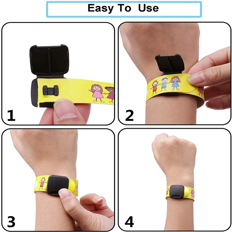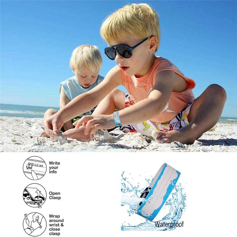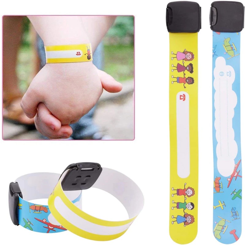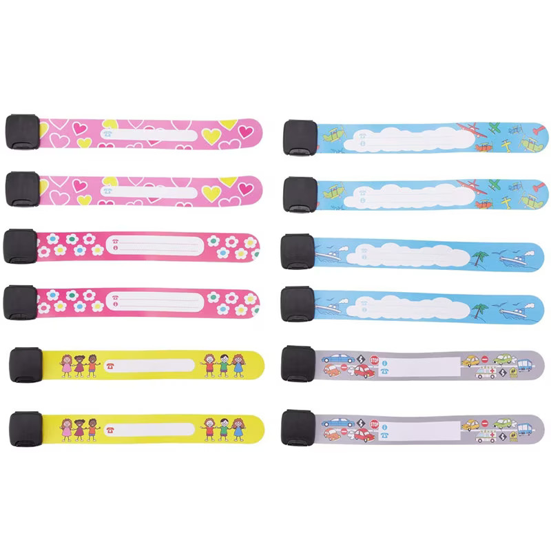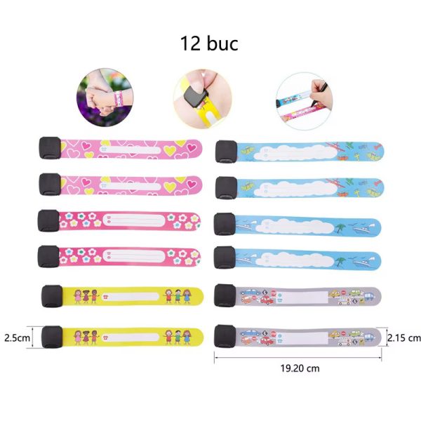 Set 12 bratari identificare copii, inscriptionabile, nume, numar telefon, anti pierdere, refolosibile, multicolor, bebeLOGIC™
